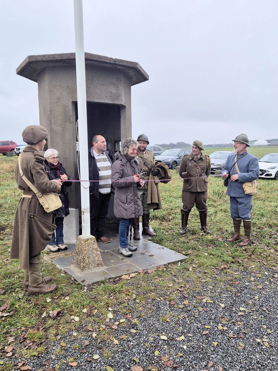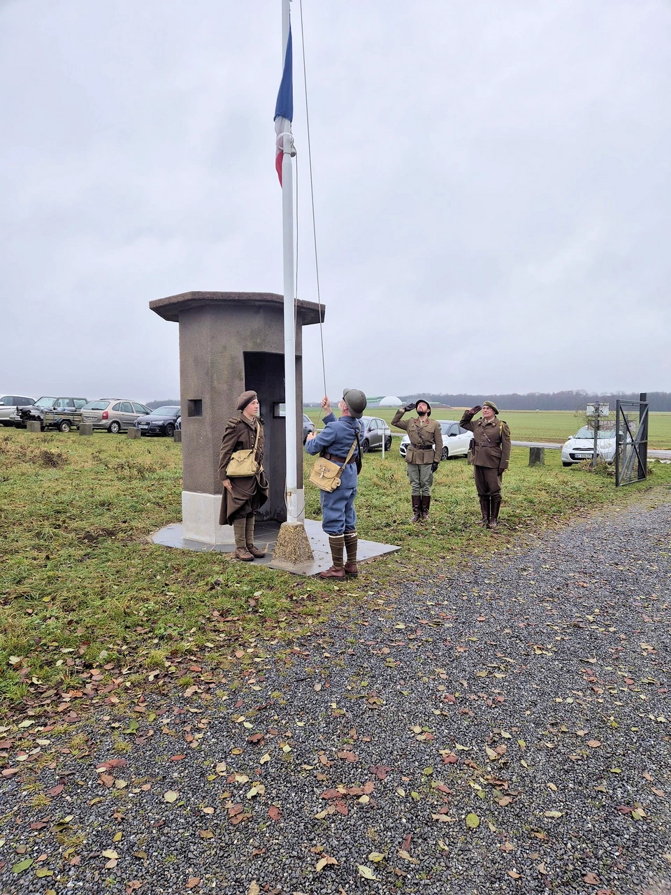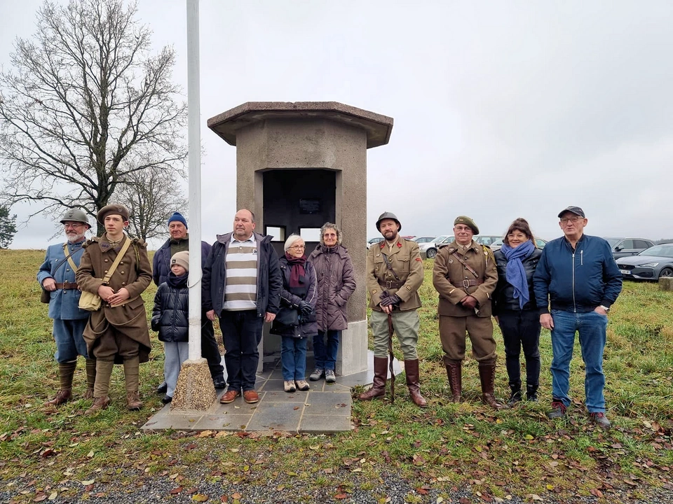 À leurs côtés, la famille Richard de Morfontaine, dont l'aide, aux côtés de la famille Pierçon, de Baslieux, fut déterminante pour la manutention de la guérite de 3,5 tonnes, Madame Patricia Benedetti, qui part une généreuse donation a financé la dalle bétonnée supportant l'ensemble et Monsieur Jean-Marie Maurice, qui nous a offert de belles dalles en béton pour assurer la finition, ont assisté à la levée des couleurs animée par nos bénévoles Louis, Alain, Michaël et Fabien. Un petit événement qui ne s'est pas produit depuis 1940 !