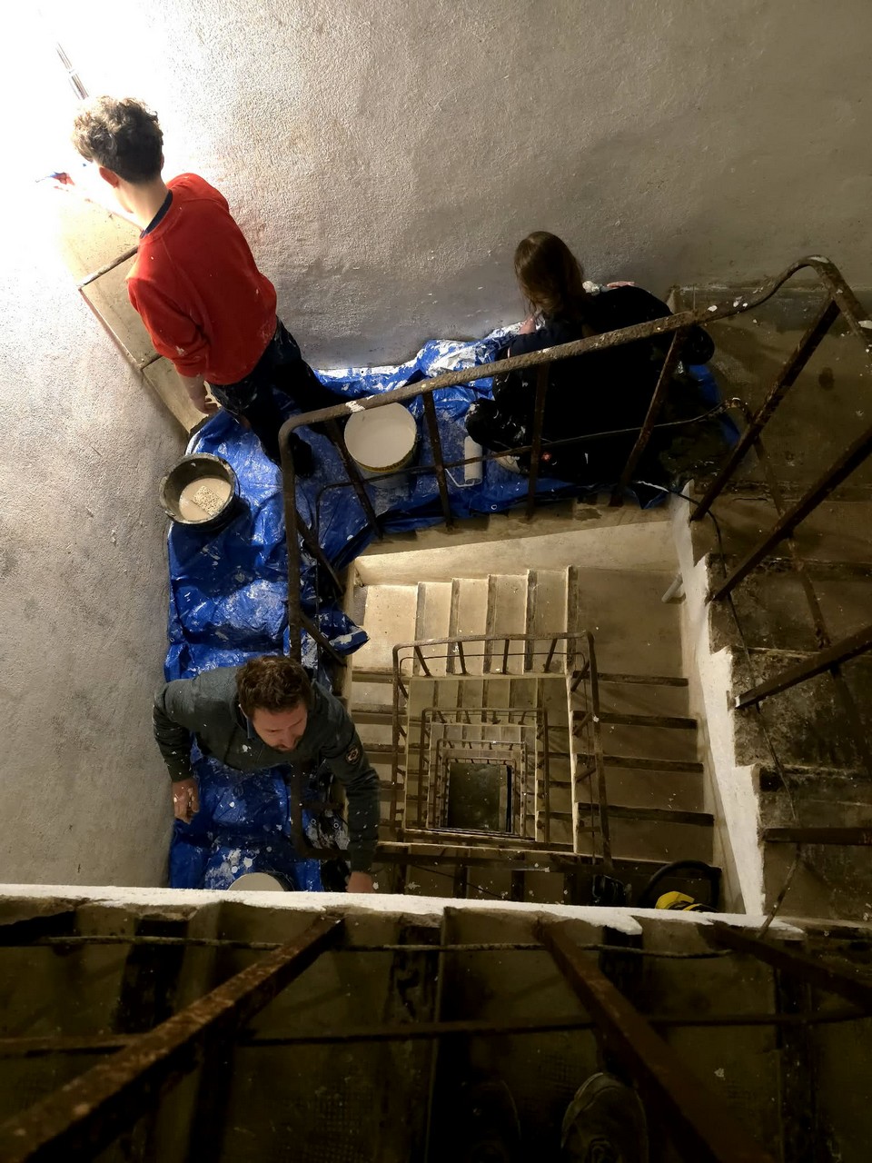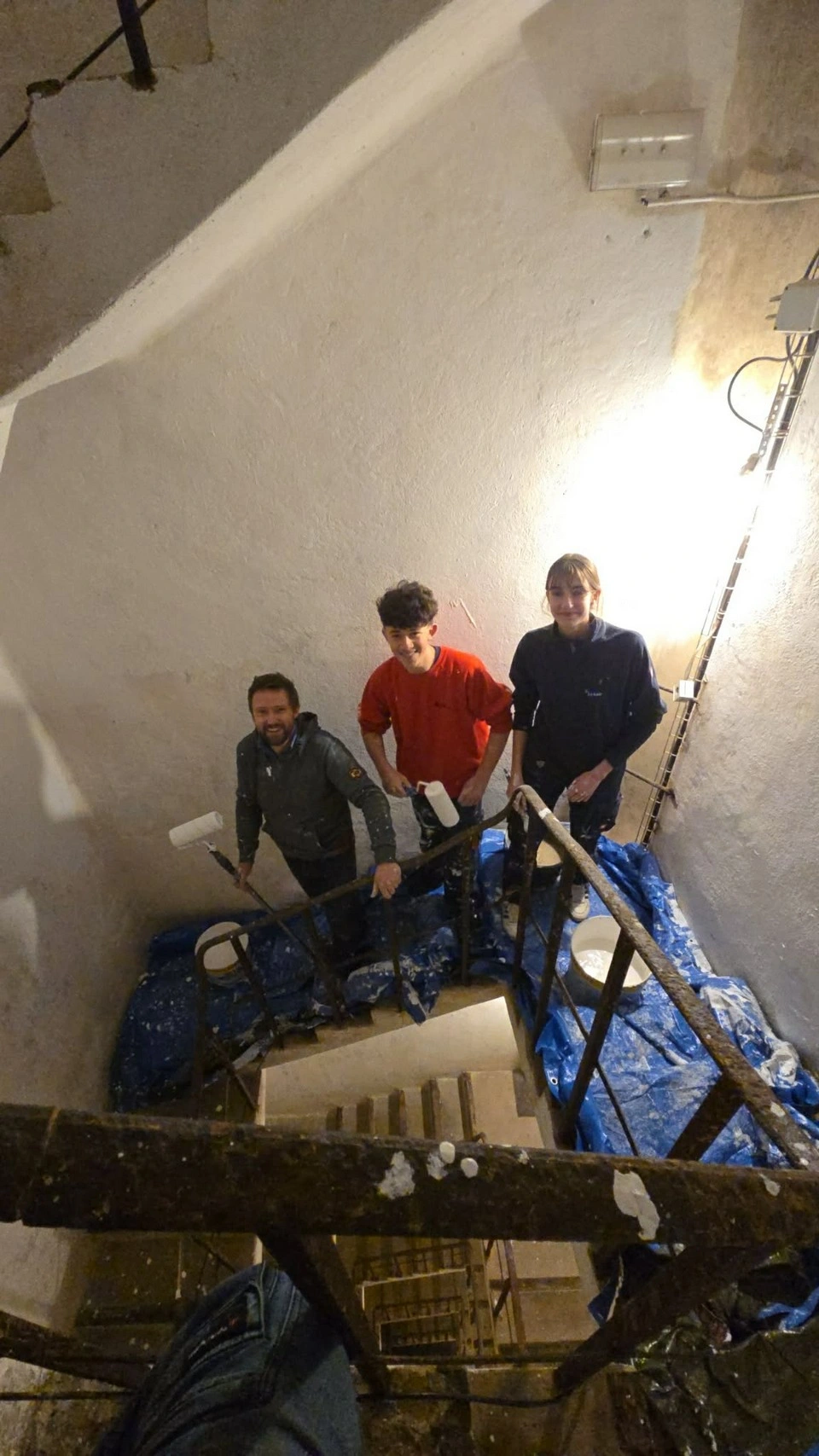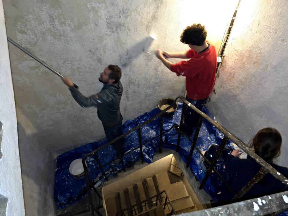 Cependant que Jean-Louis travaille à la restauration des futurs lampes murales, Charlotte, Michaël et Louis ont achevé le grattage des parois aux mille racoins et entamé les travaux de peinture. En route pour la pose de la couche d'apprêt... et il y a de quoi faire !